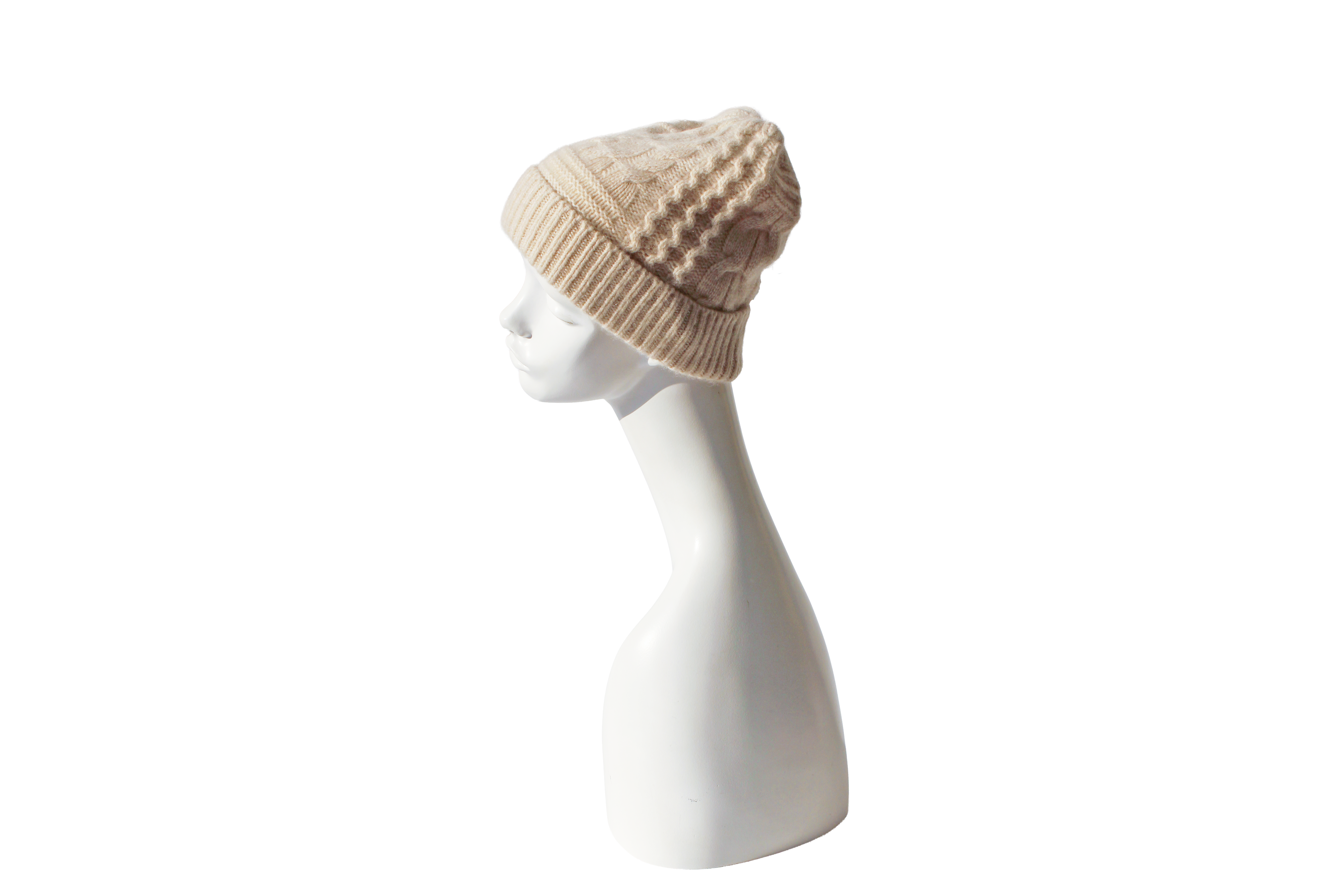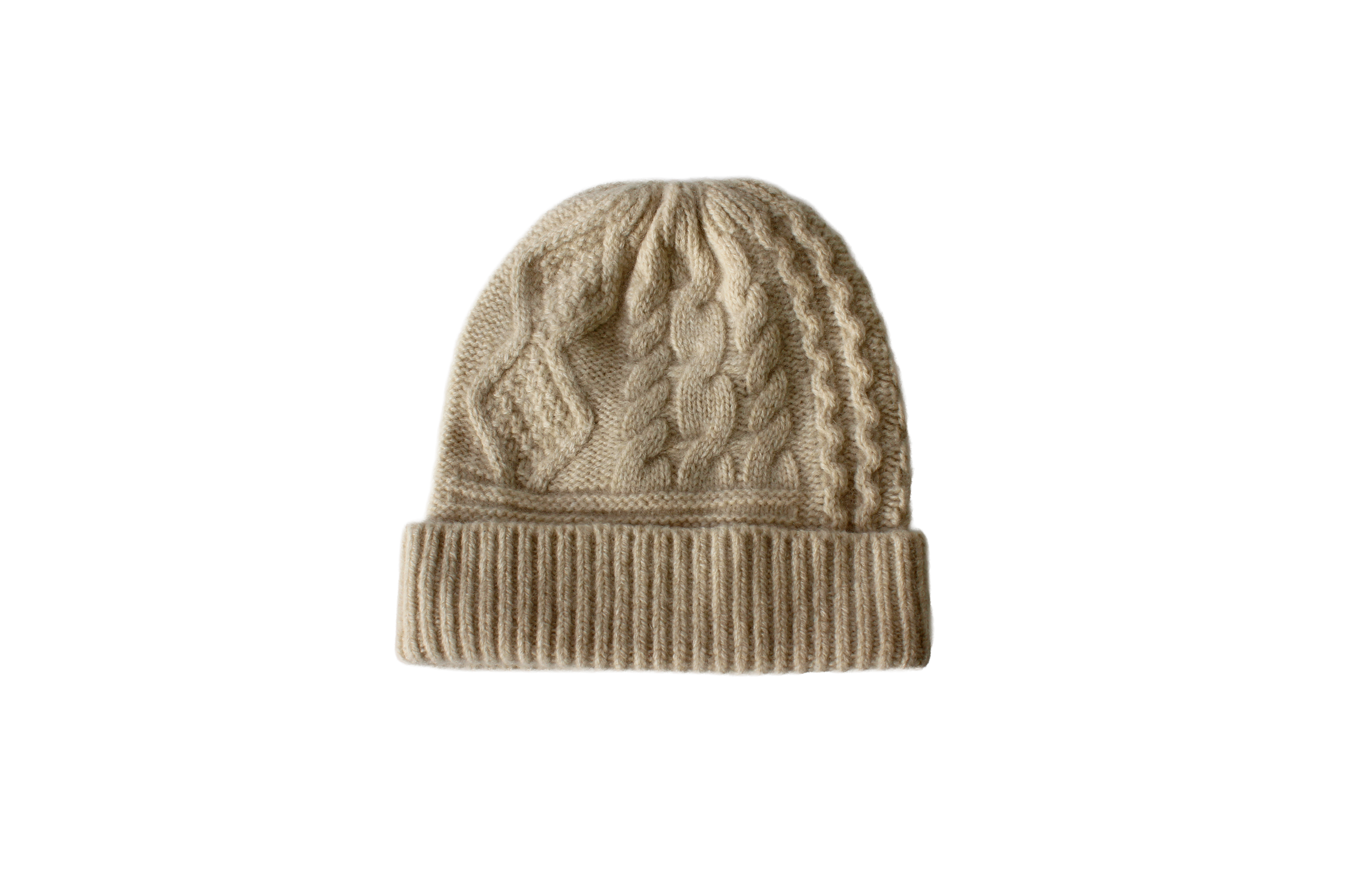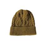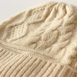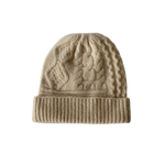 フロントには表情豊かなケーブル編み柄を、折り返し部分にはすっきりとしたリブ編みを配したデザイン。立体感のある編み地が顔まわりに陰影をつくり、シンプルな装いのポイントに。